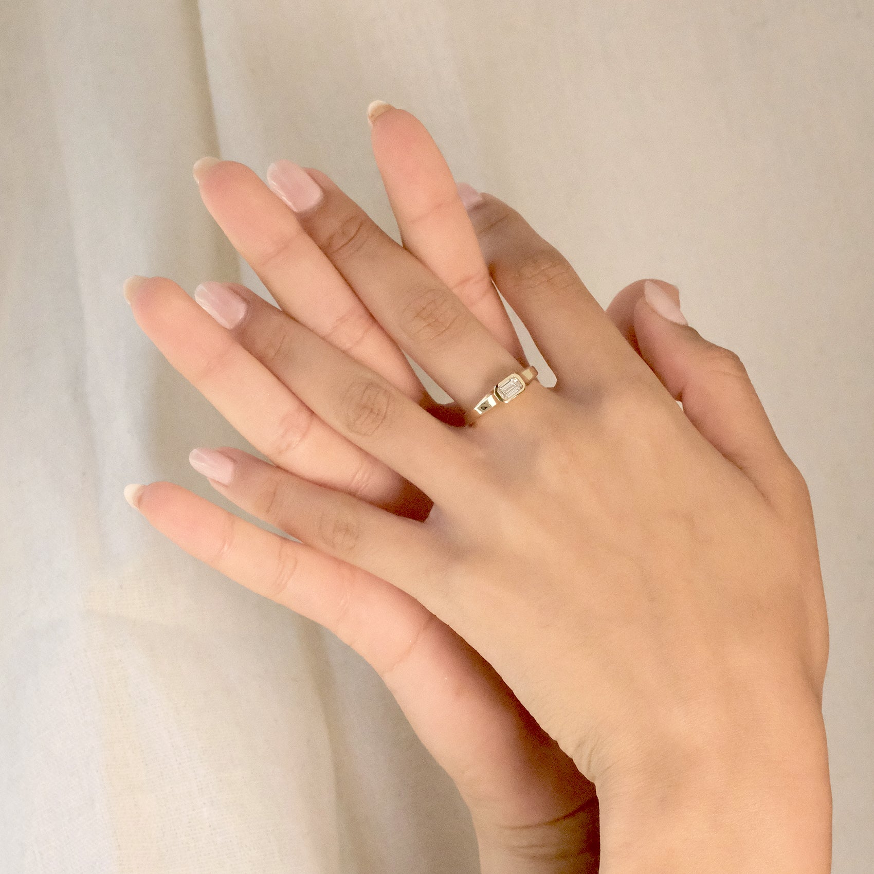 An architectural , art deco inspired ring featuring clean lines for effortless elegance. Bezel setting for a seamless flow and maximum comfort and protection of the stone.