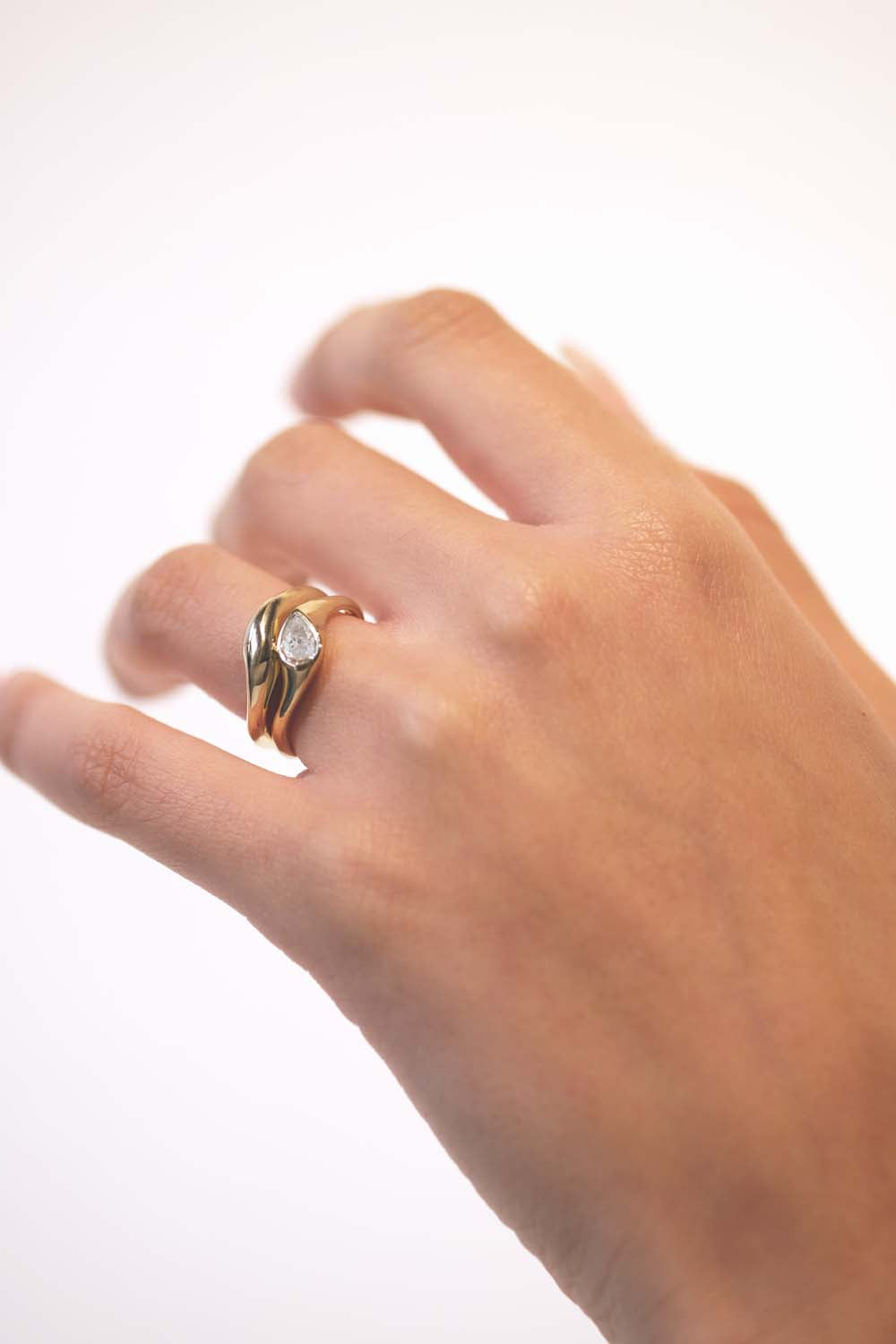 A chunky 14K solid gold ring hand crafted to portray the organic flow of water traces. Perfectly fit to pair and stack with the Diamond Drop I ring. Although her presence is more than enough for a bold stand alone ring or as a distinctive wedding band