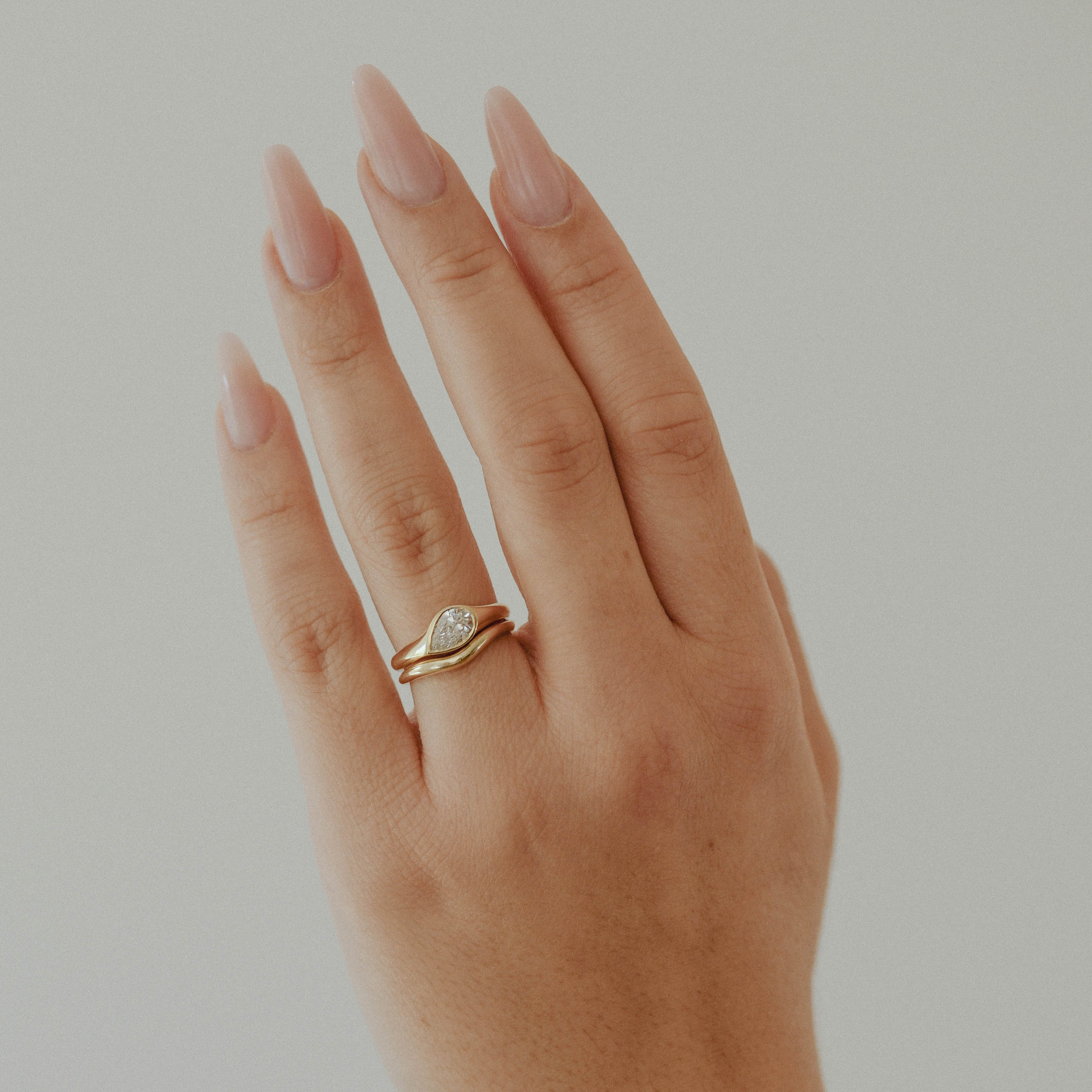 A pear-shaped diamond, also known as a "teardrop cut," elegantly set in a gold structure with a modern twist, perfectly enhancing the natural flow of the diamond's form.