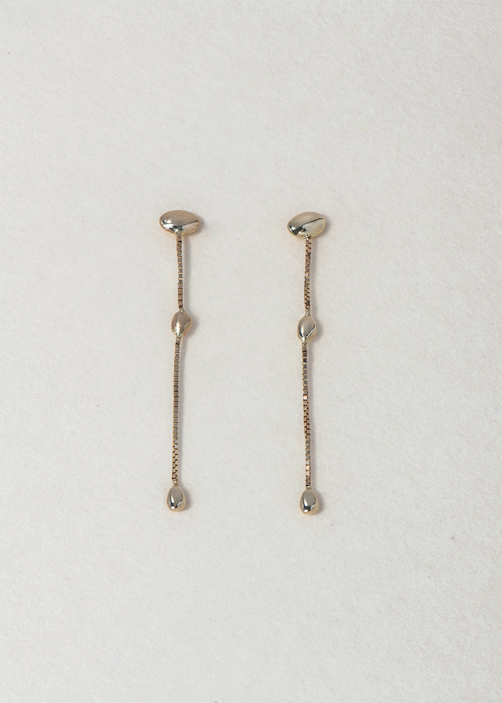 עגילי המלאנז' הם עגילי טיפה עדינים ואלגנטיים הכוללים 3 חלוקי נחל קטנים או טיפות זהב המחוברות בשרשרת זהב.